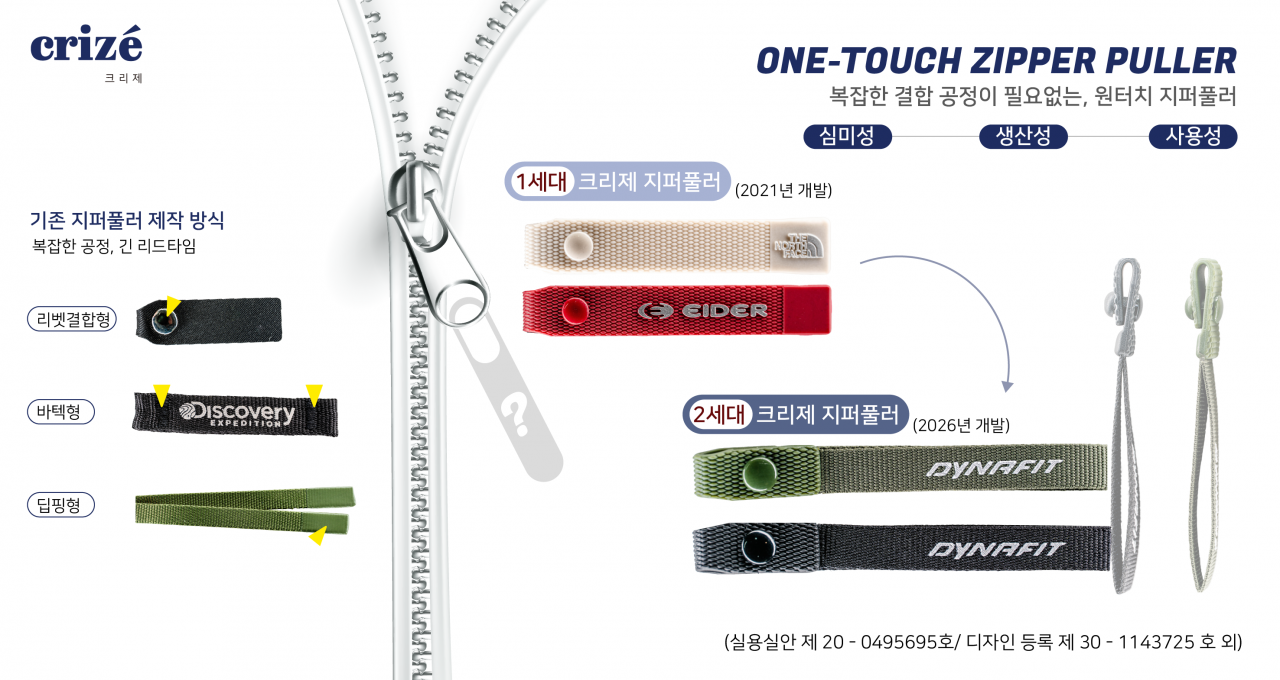 일반적인 웨빙(끈) 형태를 만들기 위해서는 최소 5가지(재단-염색-인쇄-리벳-코팅) 공정을 거쳐야 하지만, 크리제는 우레탄 ‘일체형 사출’을 개발, 웨빙의 질감과 금속 리벳의 형태까지 정교하게 표현했다. 그 결과 지퍼 시장의 ‘게임 체인저’가 됐다.