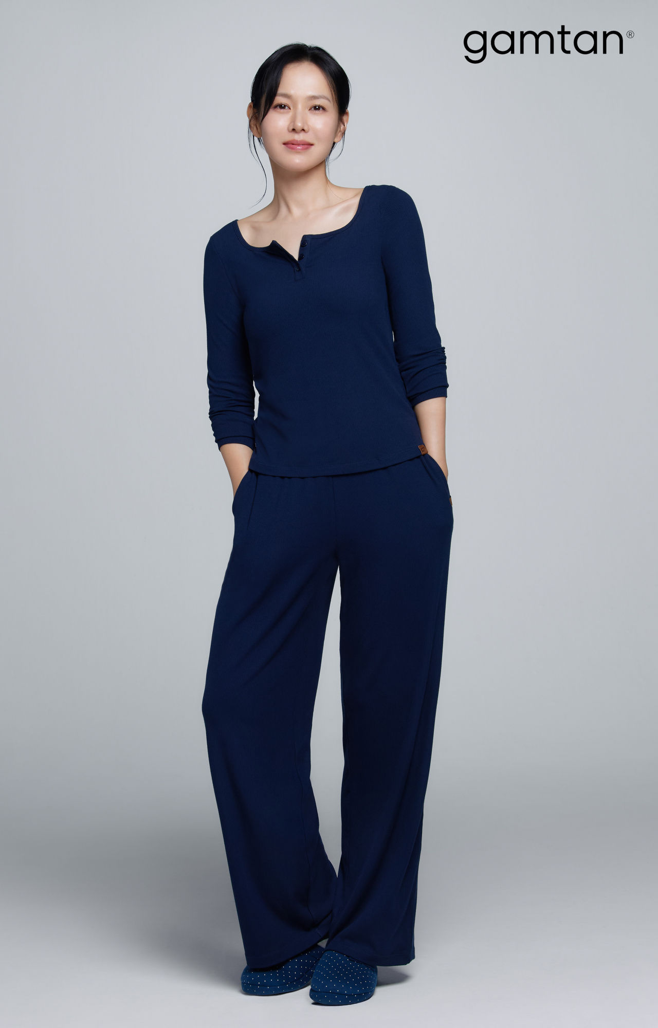 스퀘어넥 라인으로 목선을 강조해 시크하고 세련된 분위기를 자아낸다. 하의의 경우 트렌디한 와이드 핏의 팬츠로 체형을 자연스럽게 커버하면서 활동성과 편안함을 강조했다.