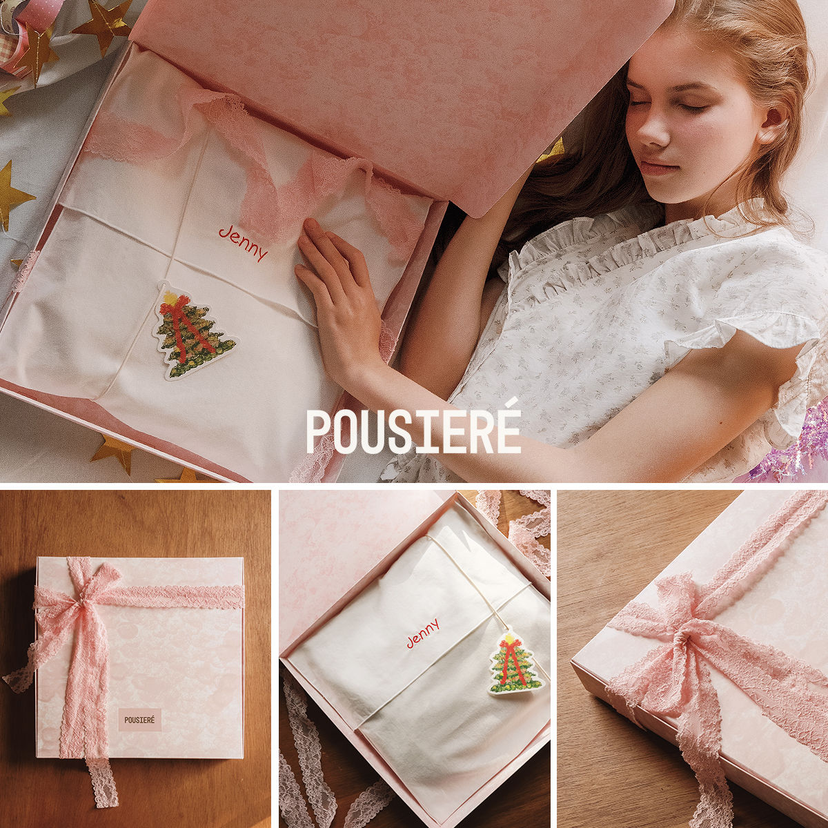 이번 서비스는 ‘선물하기 좋은 홈웨어’로의 브랜드 방향성을 강화하기 위한 핵심적인 브랜드 경험요소로, 푸쉬레(POUSIERÉ) 고유의 미감을 담은 포장재는 물론 고객이 원하는 이름 또는 문구를 더스트백에 자수로 새길 수 있어 더욱 특별하다.