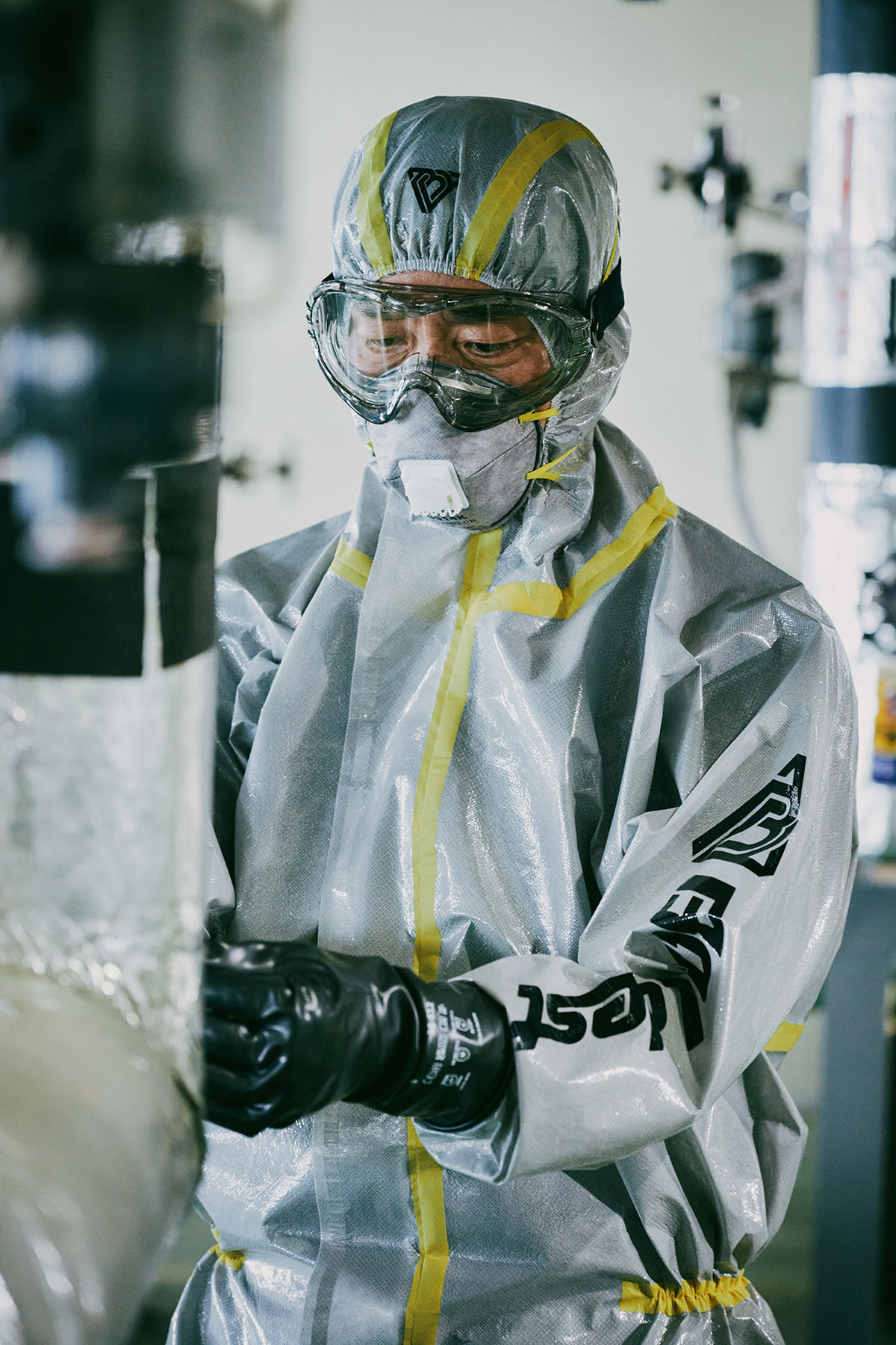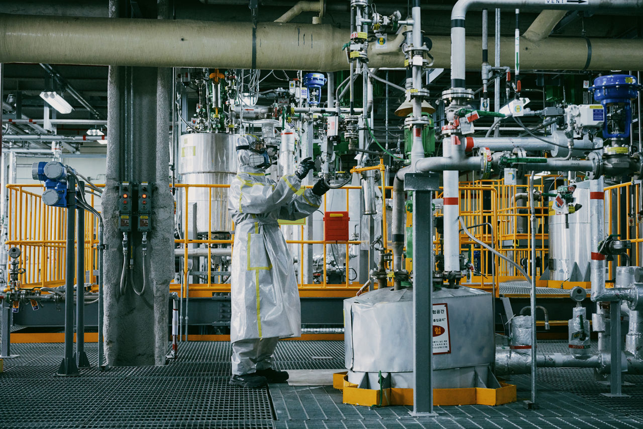 | 코오롱인더스트리 구미공장에서 볼디스트의 내화학복을 입고 근무하는 직원 모습 |