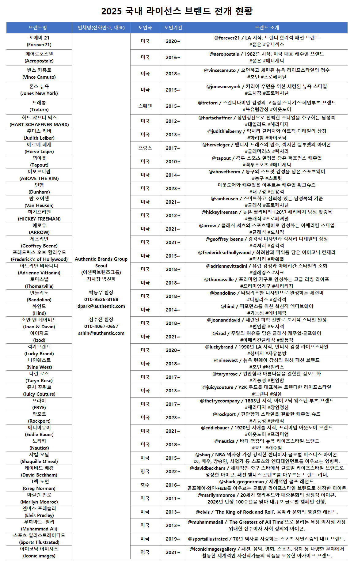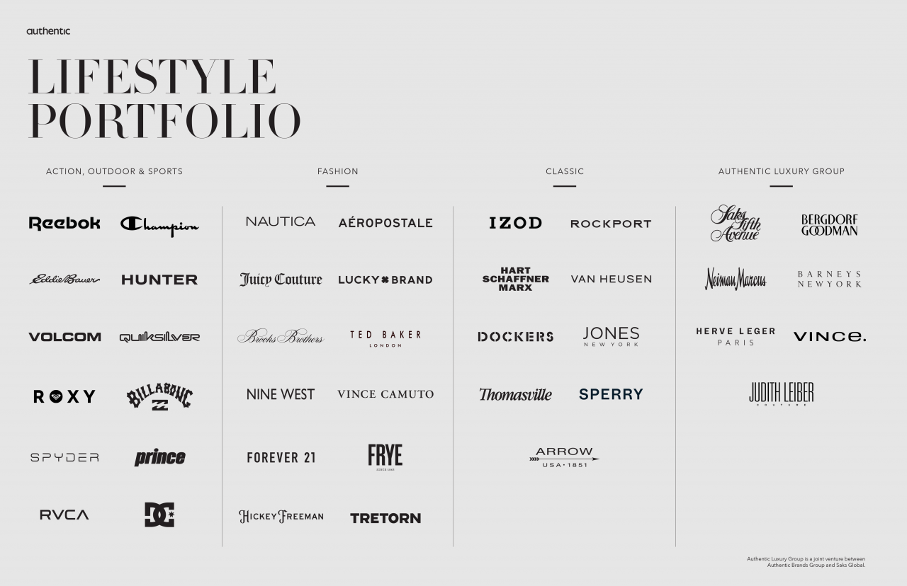 브랜드 인수를 통해 리복, 스파이더, 챔피온, 헌터, 브룩스브라더스, 데이비드 베컴, 샤킬 오닐, 앨런 아이버슨, 마릴린 먼로, 엘비스 프레슬리, 무하마드 알리 등 50개 IP를 거느리며, 에이전트가 세계 최대 규모의 오리지널 본사로 자리매김하고 있다. 파트너사들의 리테일 매출 규모는 연간 약 44조 원, 최근 ‘게스’를 인수함에 따라 55조 원까지 커질 전망이다.