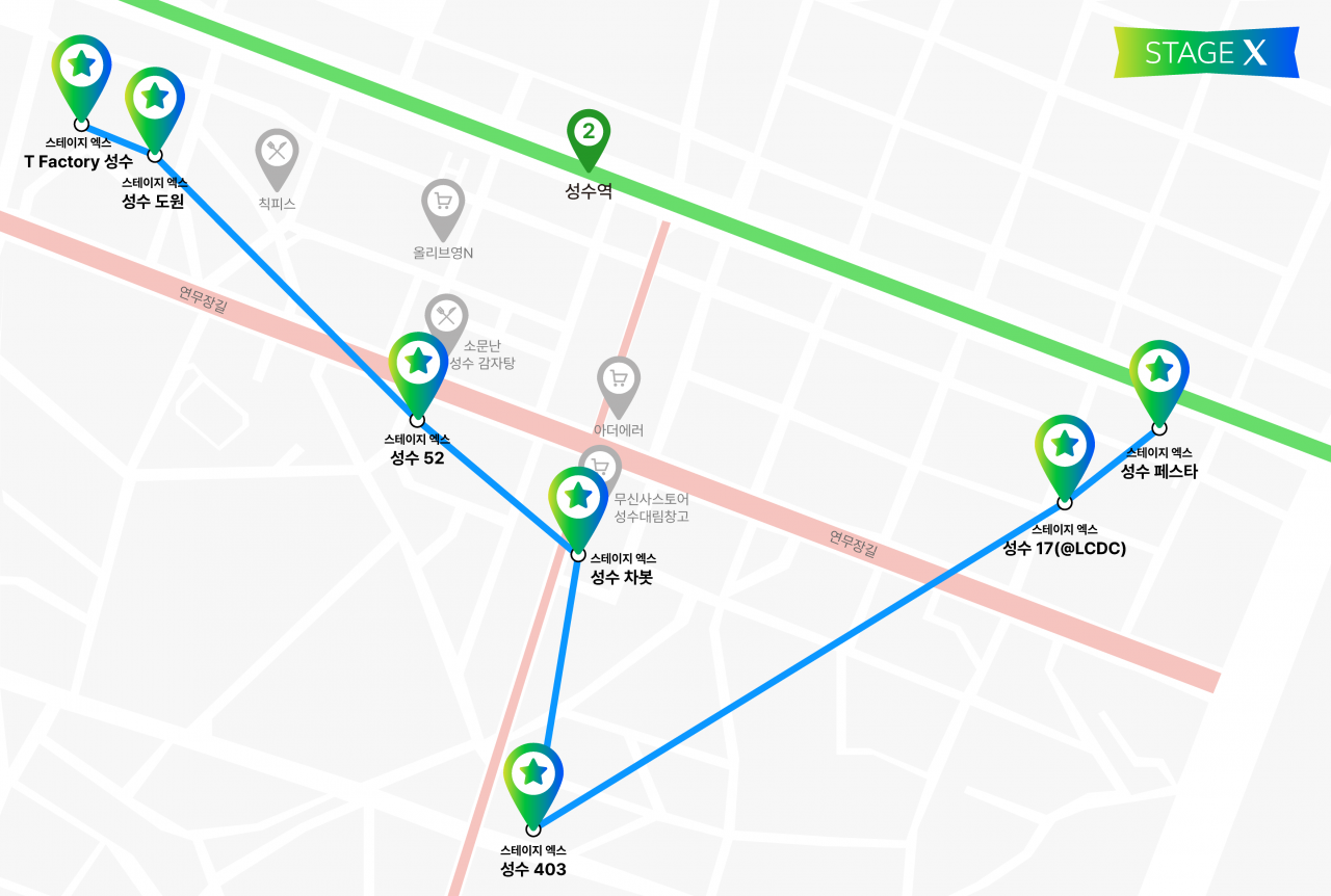 기존 1·2호점인 ‘스테이지 엑스 성수 도원’과 ‘스테이지 엑스 익선’은 운영 이후 가동률이 전년 대비 약 2배 증가했으며, 올해 새롭게 문을 연 ‘성수 403’, ‘T Factory 성수’, ‘성수 차봇’, ‘성수 52’, ‘성수 페스타’, ‘성수 17(@LCDC)’ 역시 유동 인구가 많은 주요 구역에 위치하고 있다.