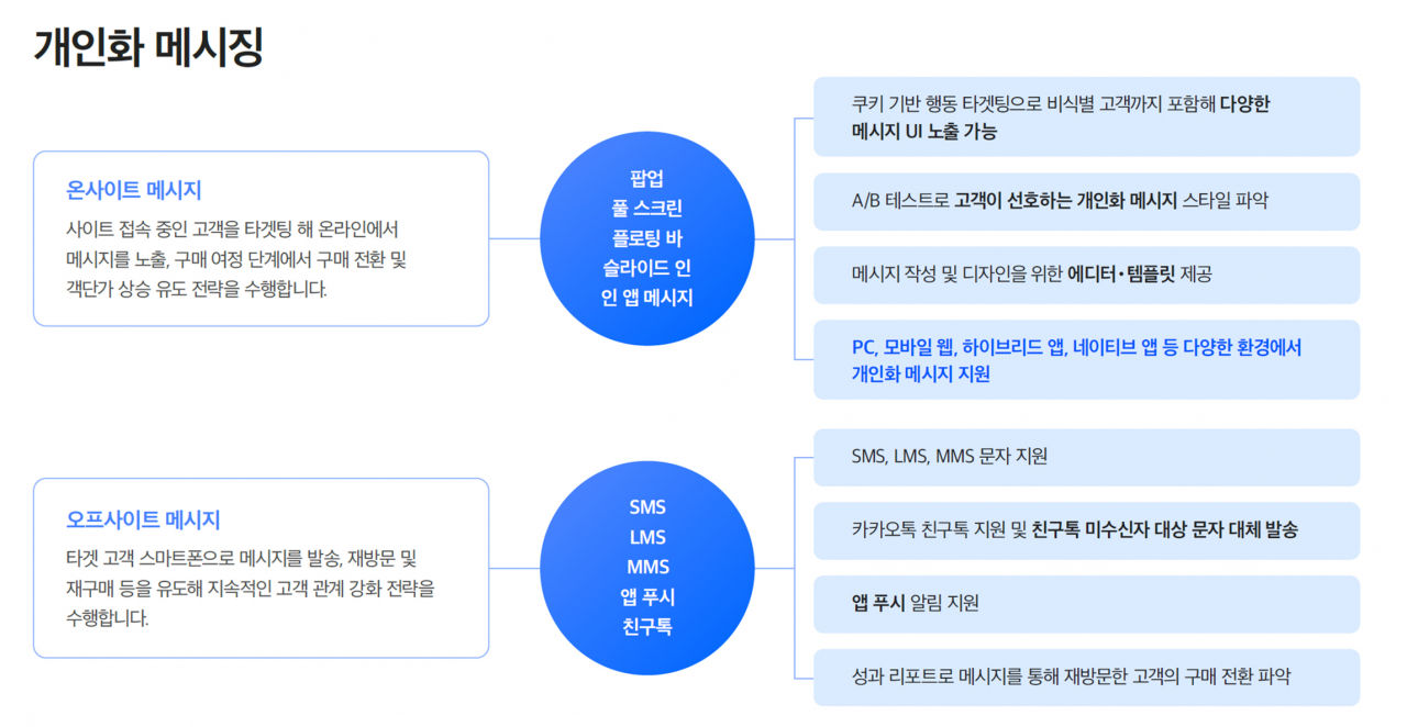 메시징 채널은 크게 '오프사이트 메시징'과 '온사이트 메시징'으로 구분할 수 있다. 오프사이트 메시징은 세그먼트 타겟 고객에게 SMS나 카카오톡, 앱 푸시 등을 활용해 고객이 이커머스 사이트에 접속하지 않은 상황에서 메시지를 전달하는 것을 의미한다. 반면, 온사이트 메시징은 세그먼트 타겟 고객이 이커머스 사이트에 접속하여 상품을 열람하는 등 고객이 현재 활동하고 있는 상황에서 실시간으로 메시지를 전달하는 것을 의미한다.