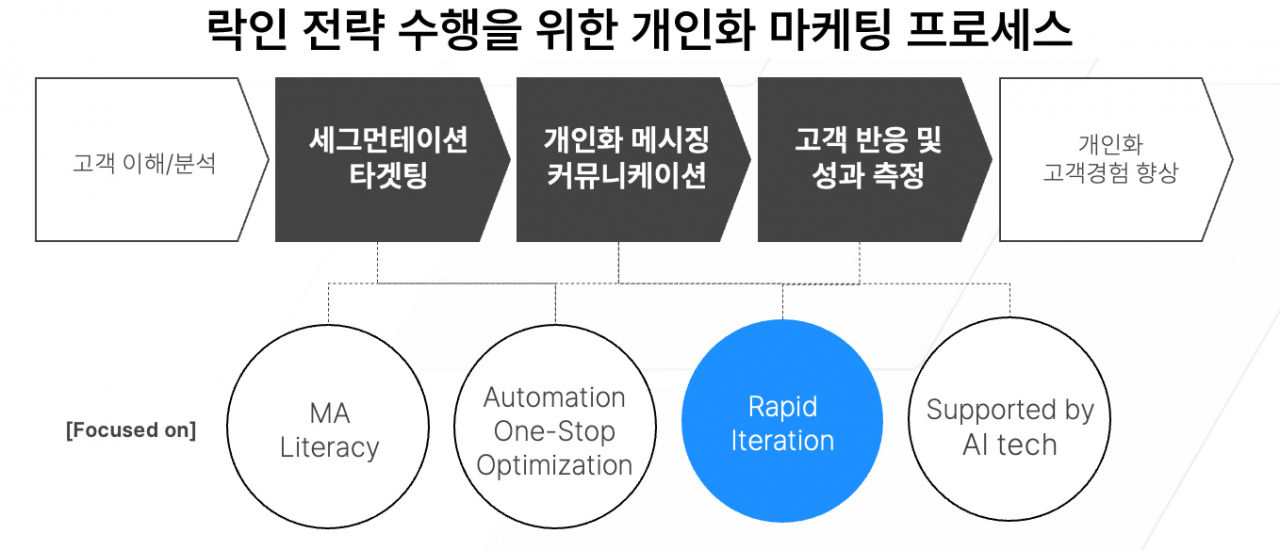 마지막으로 이 업무 실행 단계에서 가장 중요한 것은 신속한 반복인데, 이야말로 운영자(마케터)가 가장 집중해야 할 부분이다. 흔히 마케팅 자동화라고 하면 최초에 한 번 설정한 룰(규칙)에 근거해서 최대한 인적 리소스를 줄이면서도 성과나 효율을 담보해 주는 것을 기대하는 경우가 있다.