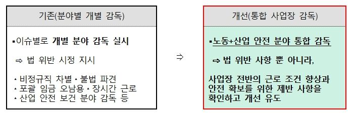 첫째, 그간은 사회적 이슈 발생시 해당 이슈에 대한 분야별 감독을 실시했으나, 올해부터는 현안이 제기된 사업장에 대해서는 「대규모 통합 사업장 감독」을 실시하여 노동과 산업 안전 전 분야에 대해 감독을 실시할 예정입니다.