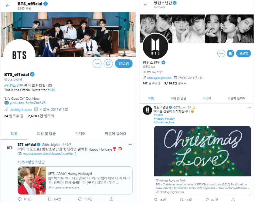 | 방탄소년단이 직접 업로드하는 계정 @ BTS_twt / BTS 공식 트위터 계정 @ bts_bighit |