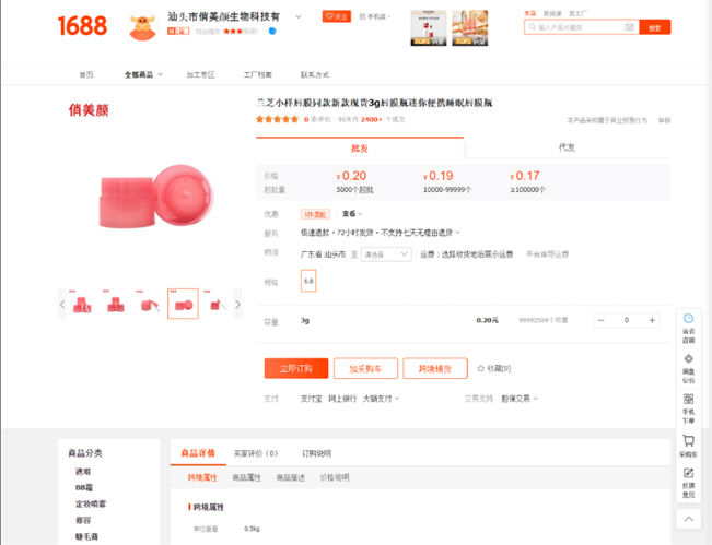 위 제품은 한국 화장품 업체인 라네즈 제품에서 로고만 뺀 형상인데, 소매업자들은 라네즈로 인식하고 대량으로 주문한다. 로고는 주문이 이뤄진 후에 프린팅되는데, 이와 같은 가품 로고만 전문적으로 인쇄해주는 업체들이 따로 있고, 이들은 제조 도매업체와 공생 관계로 연결되어 있다.