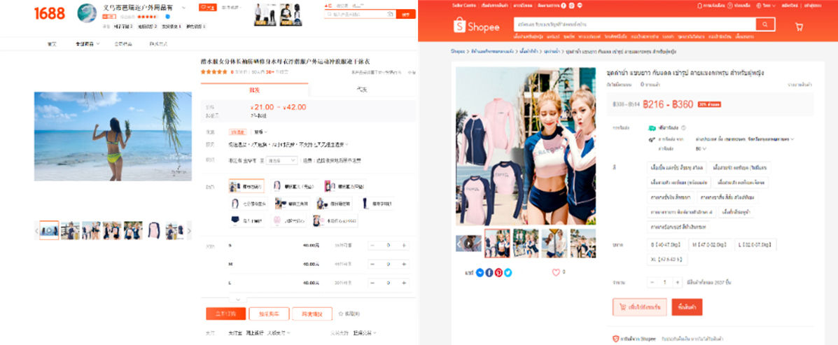 아래의 예시는 1688에서 도매로 판매된 수영복이 쇼피(Shopee)를 통해 동남아로 확산되는 것을 보여준다.