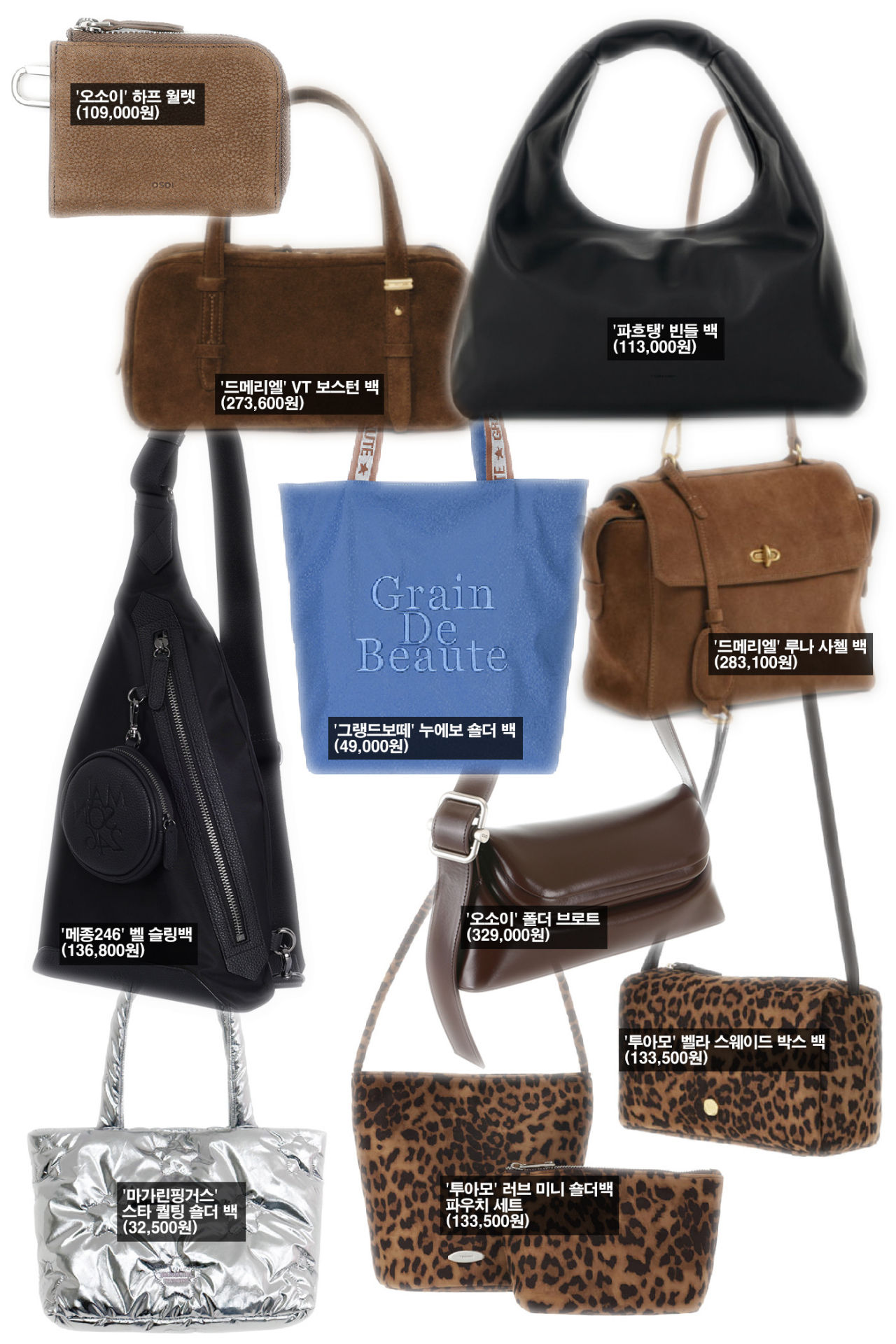 가방은 다양한 소재의 제품들이 골고루 인기다. 가죽, 스웨이드는 기본이고, 패딩, 우븐, 호피 무늬의 시어링 백 등이 차트에 올라 있다. 미니 사이즈의 인기가 시들고, 어깨에 멜 수 있는 중간 사이즈가 대세를 이루고 있다.