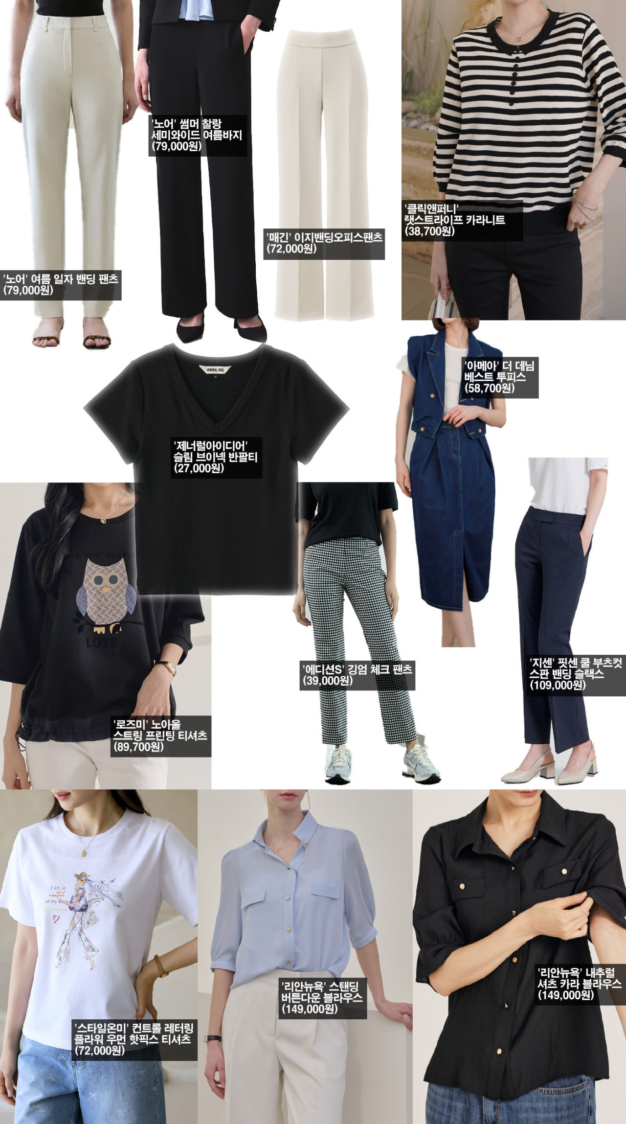 의류 카테고리 상위권에는 밴딩 슬랙스와 블라우스, 티셔츠가 주로 올라 있다. 비즈니스 캐주얼 룩에 적합한 아이템들이 인기가 높은 편으로, 아우터 등의 신상품이 출시되기 시작했지만 아직 반응은 없다.