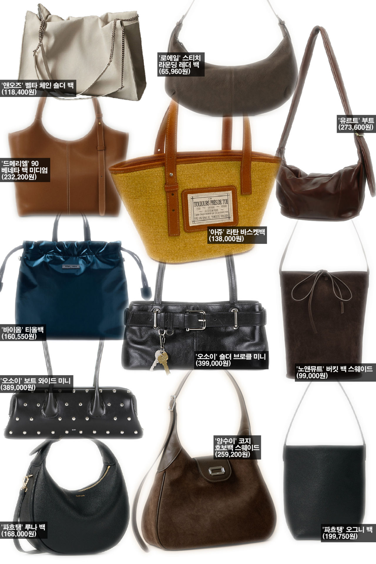 가방은 중간 사이즈의 숄더백이 대세를 이루고 있다. 브라운, 카멜 등 가을의 정취가 느껴지는 컬러들이 전면에 놓여졌고 판매량도 높은 편이다. 의류, 신발과 달리, 스웨이드 제품이 상위권에 다시 올라 있다.