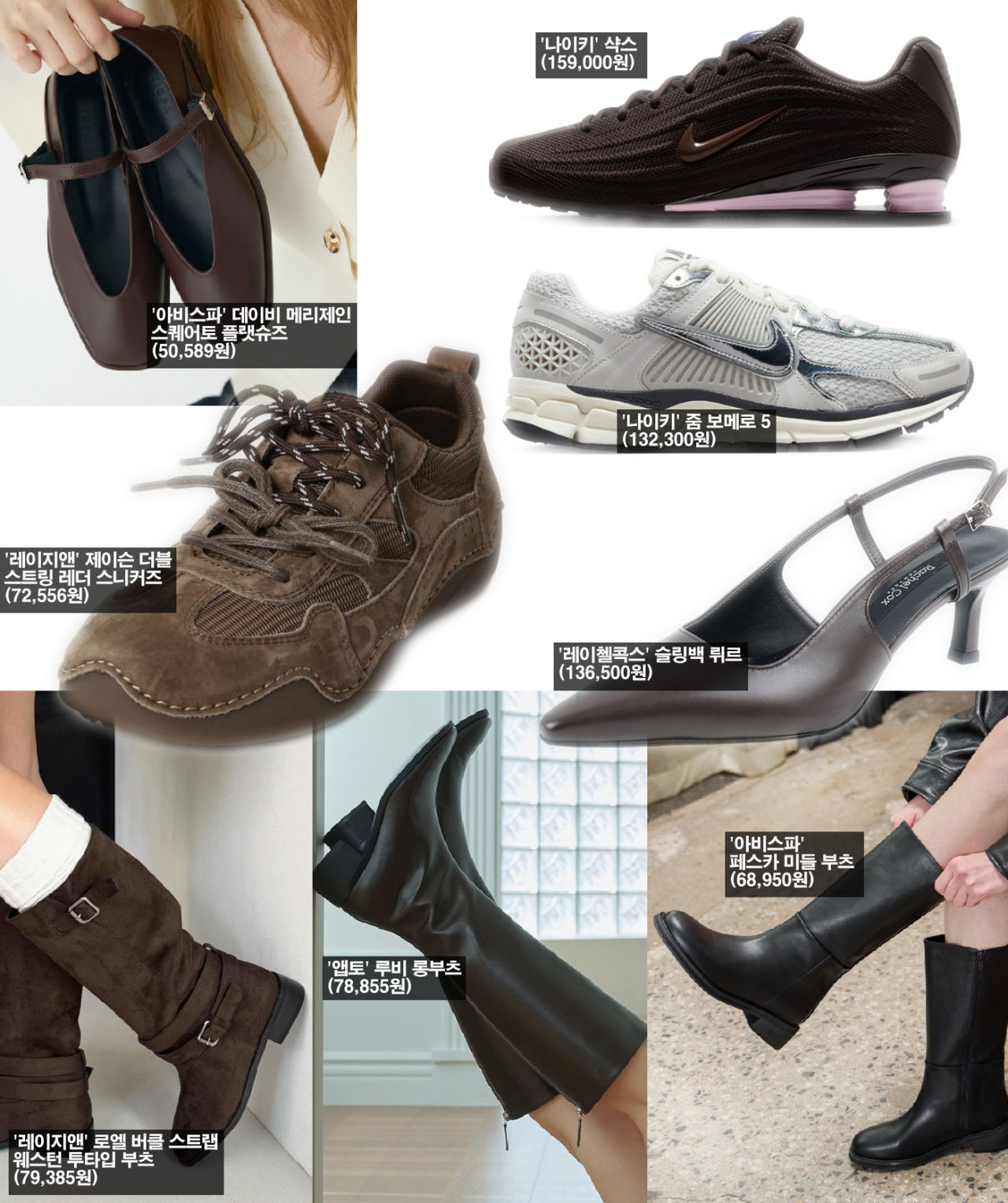신발은 비교적 다양하게 인기를 얻고 있다. 부츠가 본격적으로 판매되기 시작했는데, 스니커즈와 메리제인, 슬링백 샌들 등이 여전히 상위권에 올라 있다. 신발에서도 스웨이드 제품이 인기다. 나이키와 레이지앤 스니커즈가 스웨이드로 제작돼 인기가 급상승했고, 레이지앤의 스웨이드 롱부츠도 인기 차트에 올라 있다.