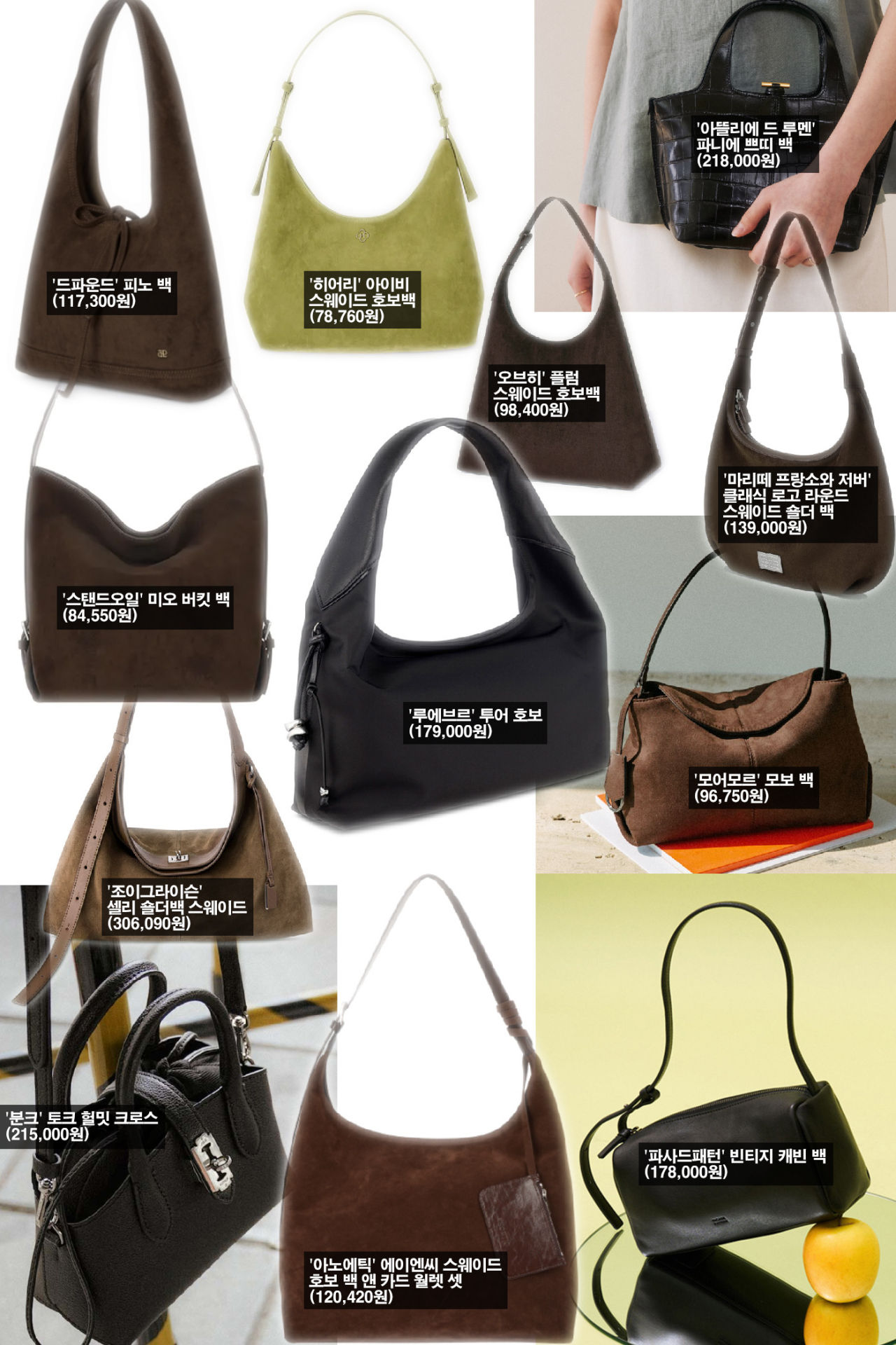 가방은 스웨이드 제품이 휩쓸고 있다 해도 과언이 아니다. 상위 12개 아이템 중 8개가 스웨이드로 제작된 제품이다. 중간 사이즈의 단순한 디자인으로 실용성을 높인 숄더백이 대세로, 브라운과 블랙 컬러가 중심을 이루고 있다.