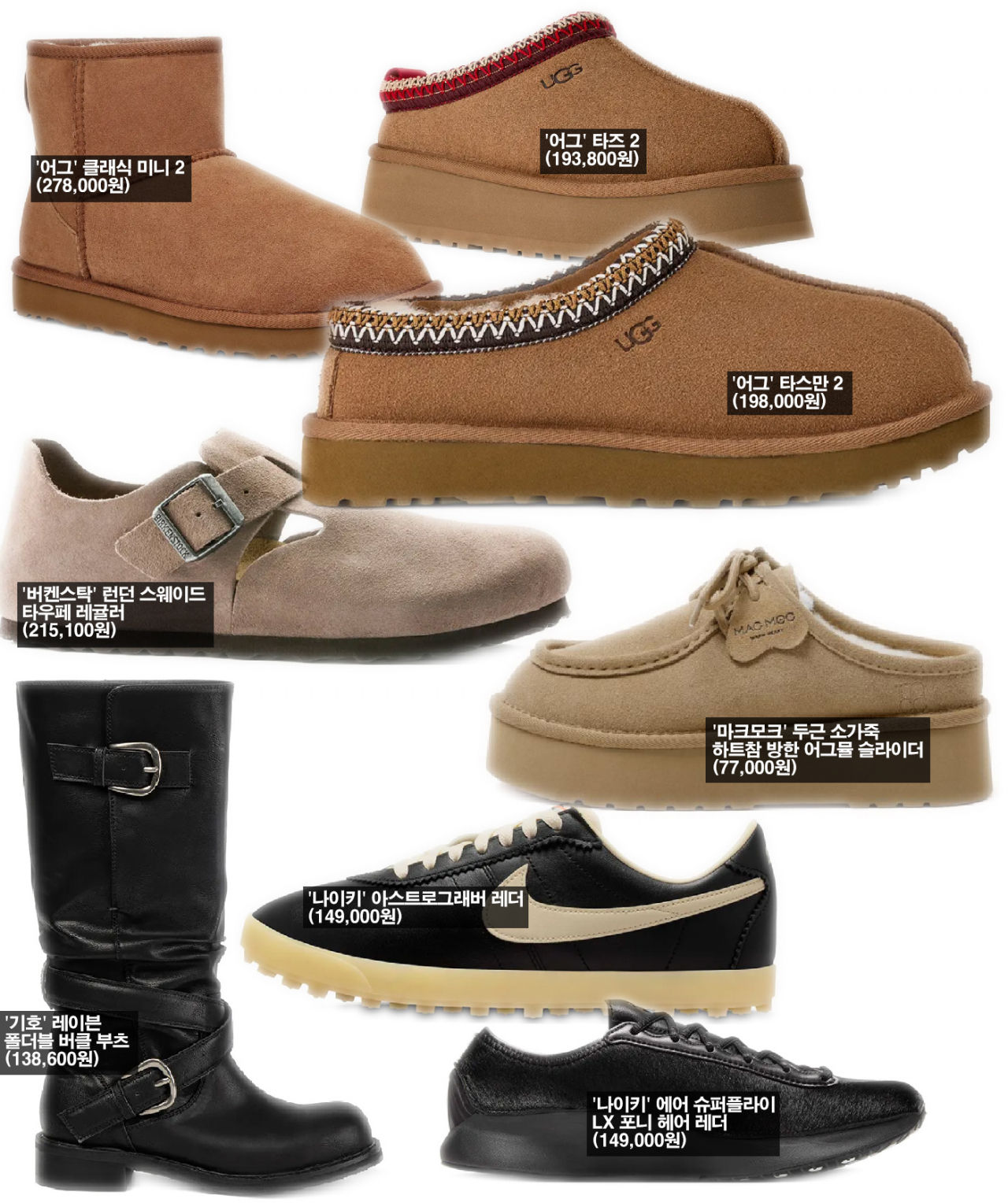 신발 카테고리에서는 ‘어그’의 복귀가 눈에 띈다. 매년 겨울 판매량이 늘어나긴 하지만, 올해는 스웨이드 트렌드까지 맞물려 일찍부터 판매가 본격화된 것으로 보인다. 어그의 3개 아이템이 랭킹에 올라 있고, 마크모크와 버켄스탁의 스웨이드 슈즈도 순위에 포함됐다. 스니커즈는 나이키 제품이 유일하고, 부츠는 예년에 비해 잠잠하다.
