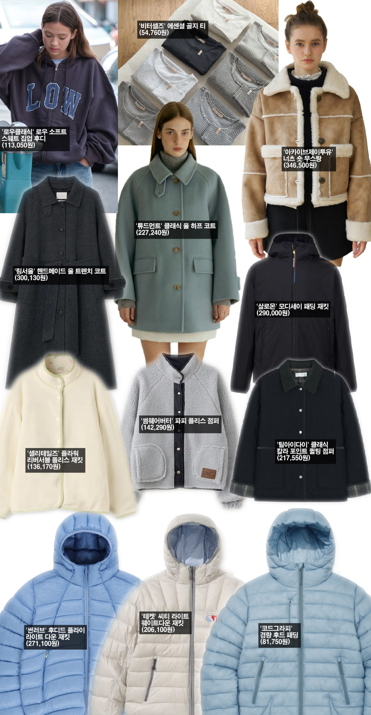 기온이 크게 내려가면서 경량 패딩과 플리스 재킷, 스웨트 집업 후디 등이 의류 랭킹 상위권을 차지했다. 아직 헤비 아우터가 본격 출시되기 전으로, 코트 수요는 이전에 비해 크게 주춤한 모습이다. 10만 원대에서 20만 원대의 경량 패딩이 아우터의 주류로 가장 많이 팔려나가고 있다.