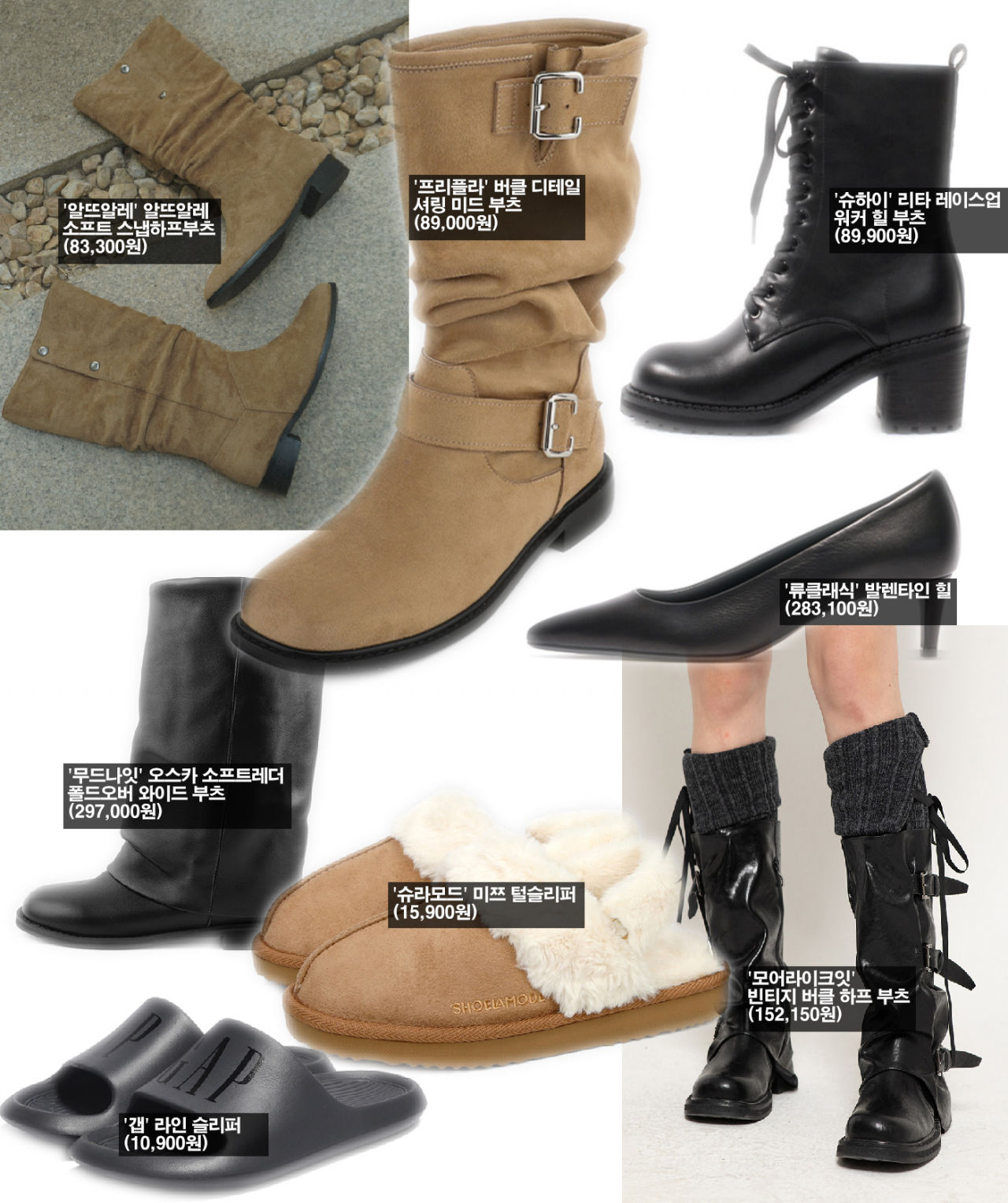 신발은 부츠를 중심으로 랭킹을 형성하고 있다. 올해는 레이스나 셔링, 버클 등 디테일이 화려한 제품들이 인기를 얻고 있다. 기장은 종아리 가운데의 미들 높이가 대세다. 가죽과 스웨이드 제품이 동시에 팔려나가고 있다. 털슬리퍼와 슬리퍼가 동시에 랭킹에 오르기도 했다.