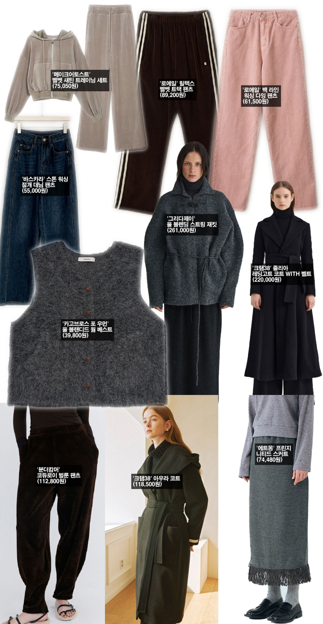 의류는 코트와 니트, 편안한 오버핏의 팬츠가 대세를 이루고 있다. 경량 패딩 등 다운 제품은 랭킹에 오르지 못했다. 베스트와 카디건 니트, 트레이닝 팬츠 등 단품이 중심을 이루는 가운데, 코트는 주로 긴 기장의 제품이 인기를 얻고 있다.