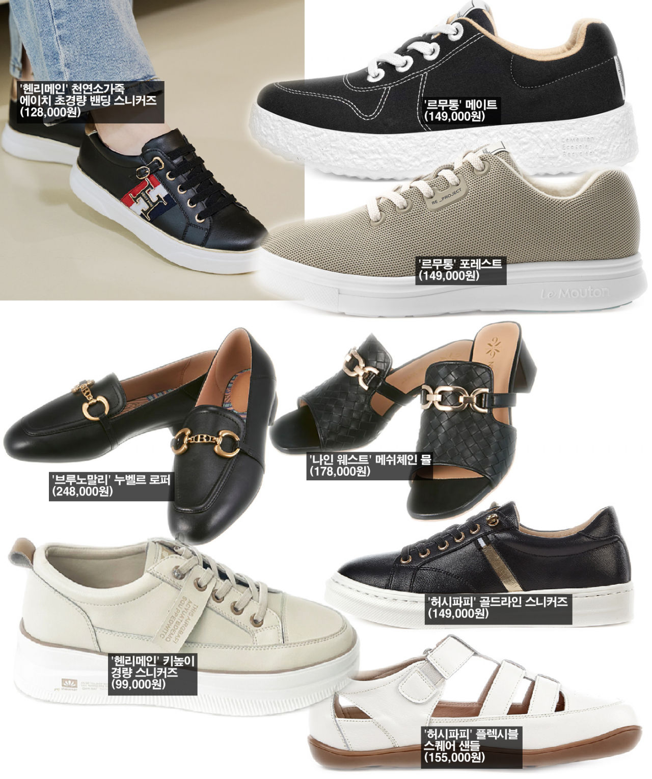 신발은 키높이 스니커즈가 중심을 이루고 있다. 연령대가 높은 만큼 키높이 제품이 인기가 많고, 일부 로퍼도 순위를 지키고 있다. 부츠는 아직 차트에 오른 제품이 없다.
