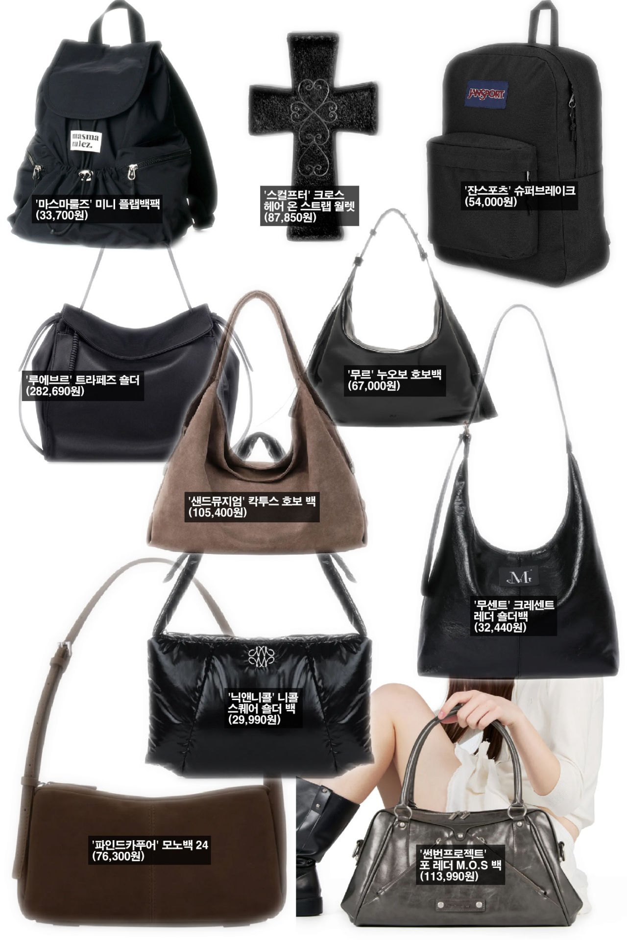 가방은 여성 제품이 중심이다. 가죽, 스웨이드, 나일론 백 등 다양한 제품이 고루 팔려나간 가운데, 어깨에 맬수 있는 중간 사이즈의 외출용 제품이 대세다. 백팩은 차트에서 사라졌다.