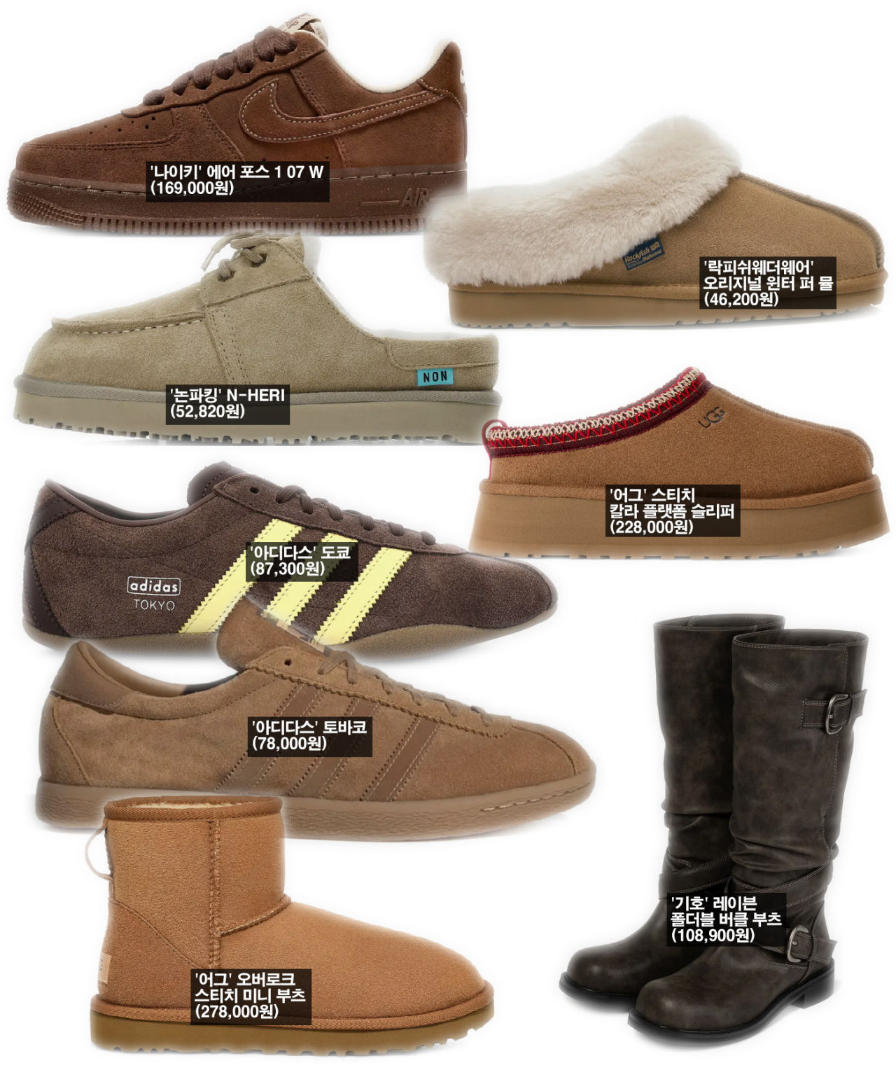 신발은 랭킹에 오른 제품의 전부가 스웨이드로 제작한 것들이다. ‘기호‘의 버클 부츠를 제외하고는 스니커즈와 뮬, 미니 부츠 모두 스웨이드 제품이다. 스니커즈는 ‘나이키‘와 ‘아디다스‘ 제품이 차트에 올랐고, ‘어그‘와 ‘락피쉬웨터웨어‘의 양모 제품이 본격적으로 팔려나가고 있다. 부츠는 인기가 없다.