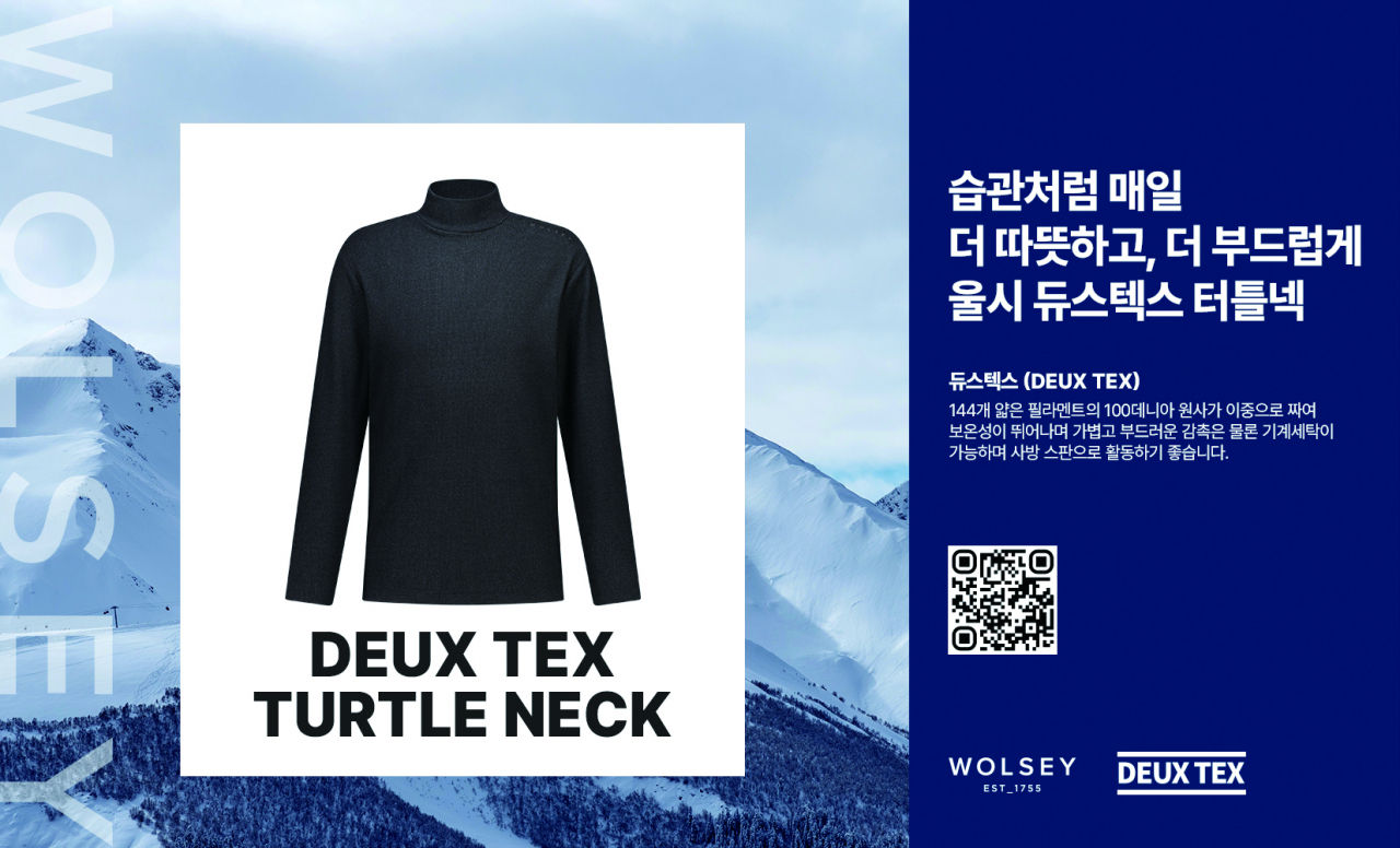 그중에서도 지난해 출시 한 달 만에 완판된 듀스텍스 터틀넥 제품군을 이번 시즌 한층 강화했다. ‘듀스텍스’ 원단의 강점이 배가될 수 있도록 디자인된 넉넉한 터틀넥 디자인, 모크넥 스타일 등의 제품군을 선보였다. 컬러 옵션도 확대, 남녀 각각 4가지 컬러를 선보인다. 대체 캐시미어로 불리는 ‘듀스텍스’는 144개 필라멘트의 100데니아 원사를 이중 짜임으로 완성, 조직이 치밀하면서 동시에 공기층이 풍성해 가볍고 따뜻한 게 특징이다. 촉감도 부드럽고 물세탁이 가능해 실용적이다.