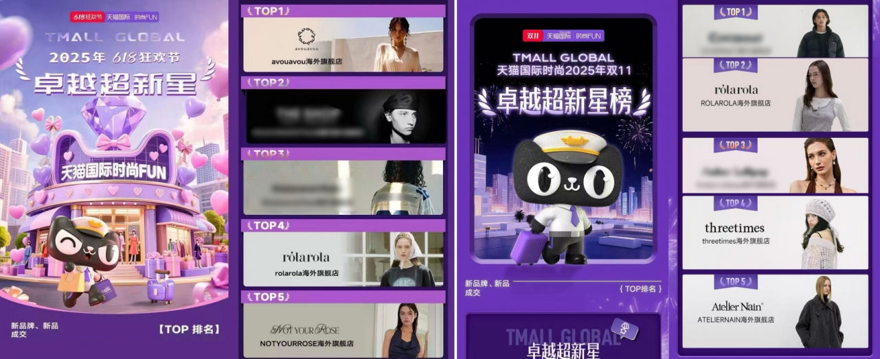 | 티몰 글로벌의 6/18 쇼핑 축제(왼쪽)와 11/11 광군제(오른쪽)에서 초신성 브랜드 톱5에 진입한 지투지인터내셔날 고객사 |