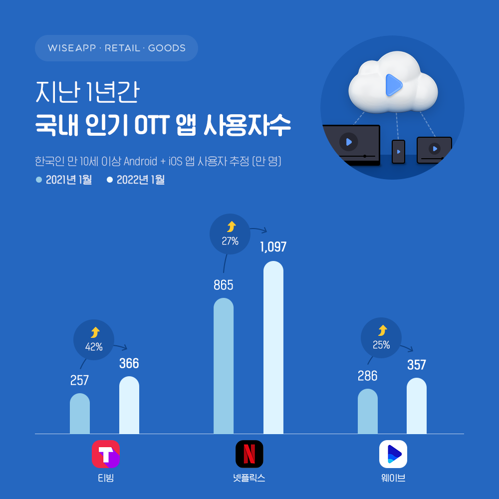 두번째로 앱 사용자수가 큰 폭의 증가율를 보인 ‘티빙’은 2021년 1월 257만 명에서 2022년 1월 366만 명으로 42% 증가하였다. 세번째로 앱 사용자수 증가율가 높았던 ‘넷플릭스’는 지난해 1월 865만 명에서 올해 1월 1,097만 명으로 27% 증가한 것으로 추정됐다. 네번째로 앱 사용자수 증가율이 높았던 ‘웨이브’는 2021년 1월 285만 명에서 2022년 357만 명으로 25% 증가한 것으로 나타났다.