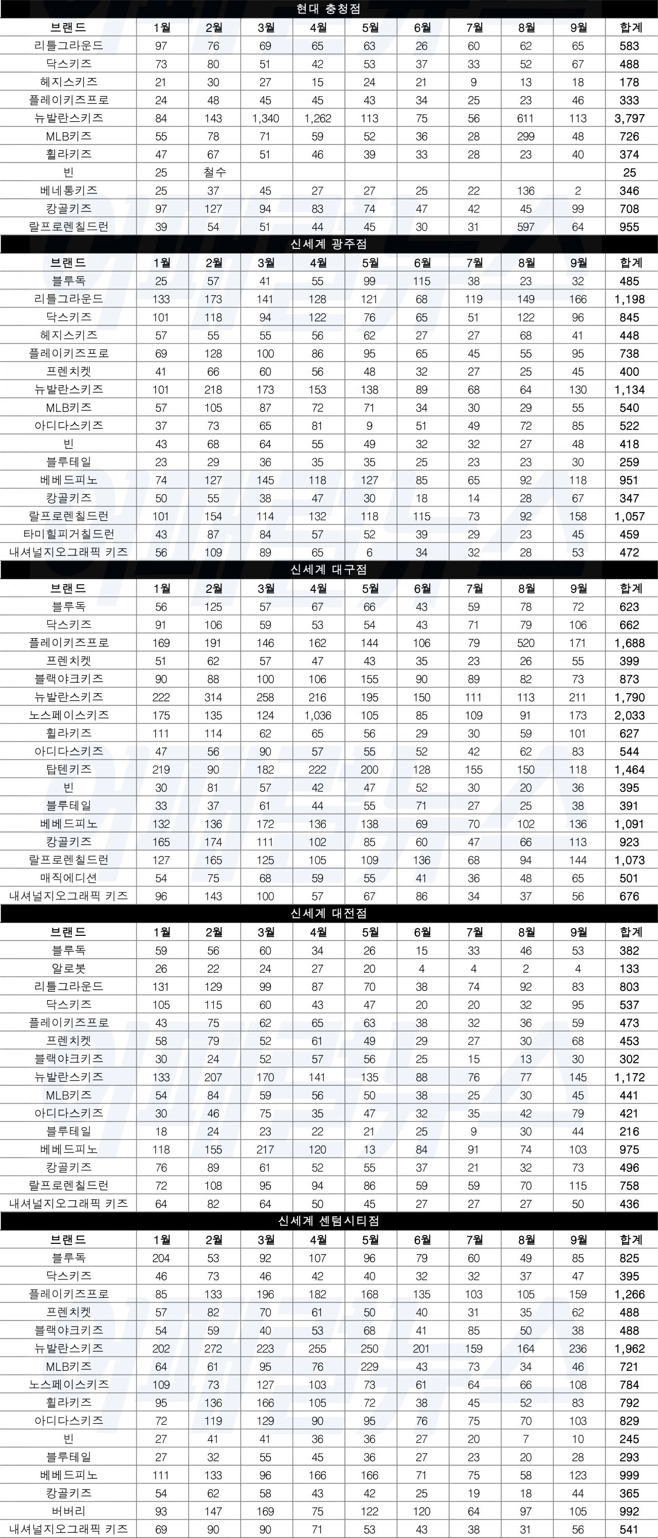 시장 점유율이 가장 높은 브랜드는 ‘뉴발란스키즈’이며 노스페이스키즈, 플레이키즈프로, 리틀그라운드, 베베드피노 등이 상위권을 장악하고 있다. 점포별 매월 1등 브랜드는 거의 변동이 없다.